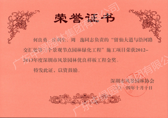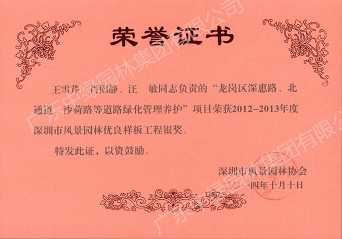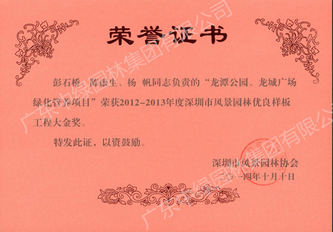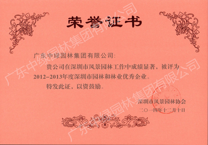 2014年,我集團在深圳市風景園林工作中成績顯著,被深圳市風景園林協會評為2012-2013年度深圳市園林和林業優秀企業。