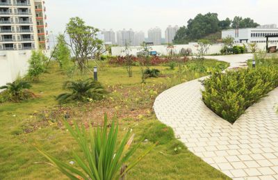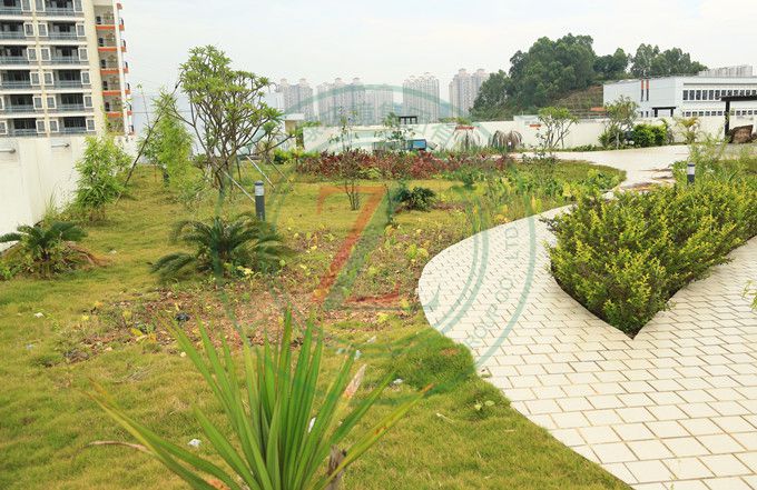 作為深圳市綠色建筑的示范工程,深圳高級技工學校新校區的建設大量應用了節能、節水、節材和環境保護等技術措施,其中包括屋頂花園的建設。其厚厚的種植土層可以有效隔絕室外的噪音和振動對教室的影響,同時起到隔熱和過濾收集屋頂雨水的作用。大面積的屋頂花園成為教學樓和生活區之間的活動場所,彌補了校園內稀缺的平面活動場所。