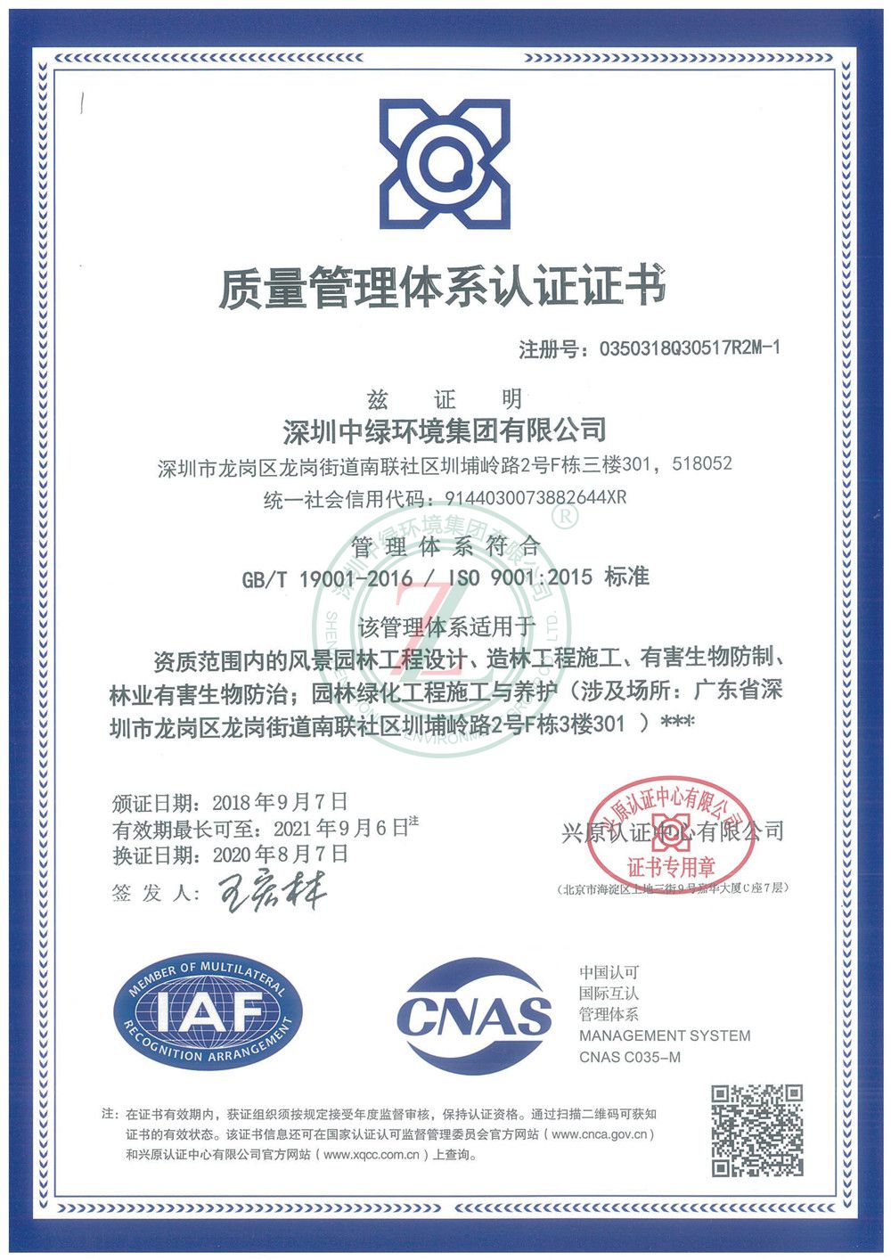 質(zhì)量管理體系認證證書(園林-設計-造林)