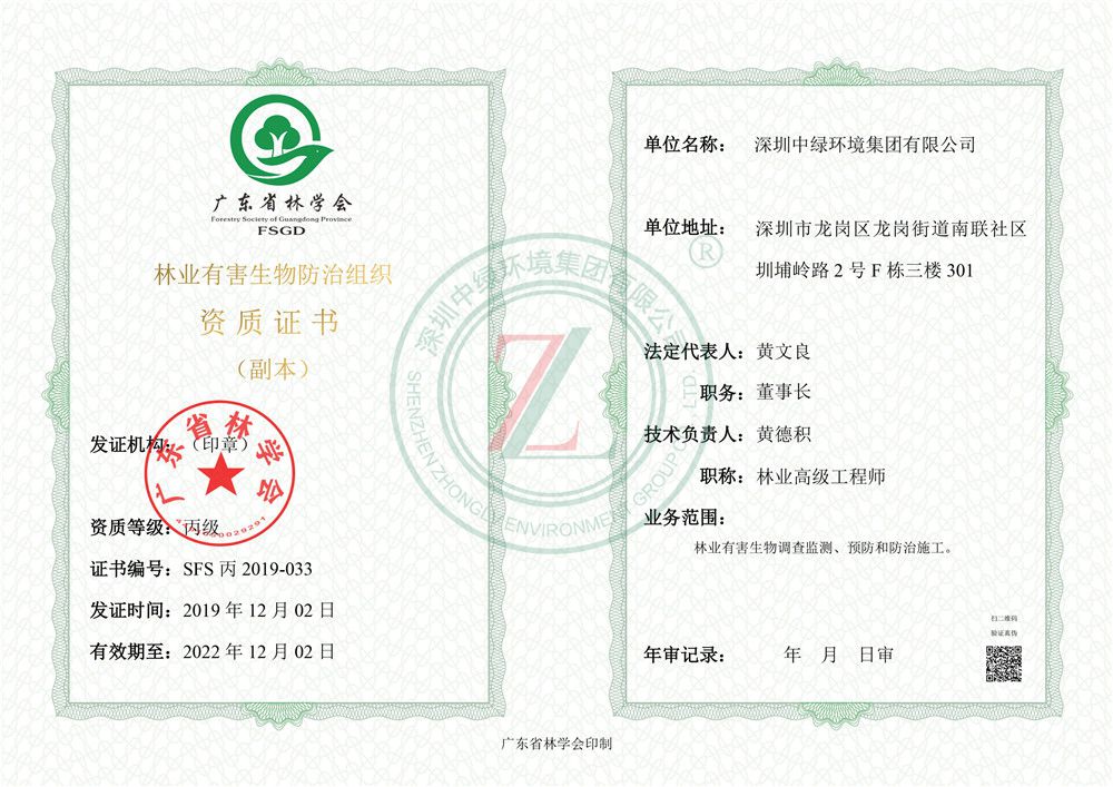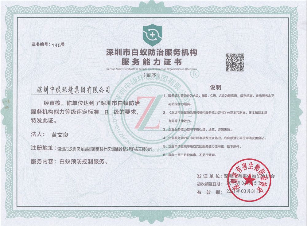 深圳市白蟻防治服務機構服務能力證書B級